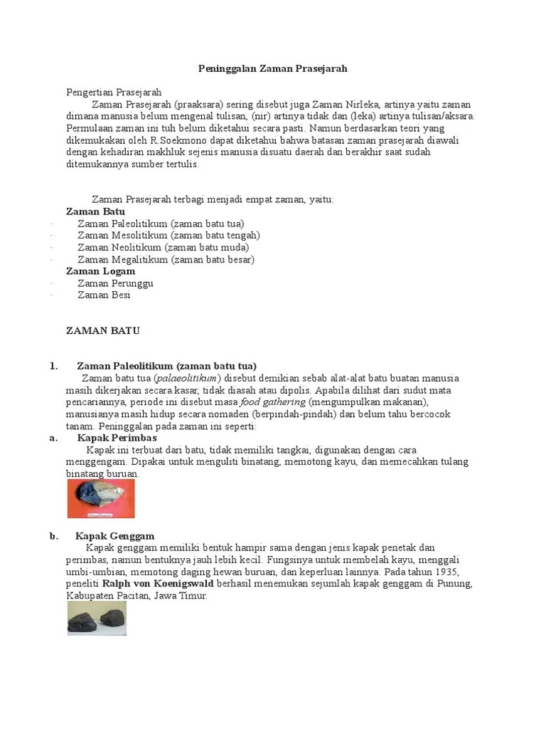 Sementara zaman batu sendiri juga mengalami perkembangan serta pembagian dalam beberapa waktu yang dikemukakan oleh j.a. Di indonesia, zaman neolitikum dimulai sekitar 1.500 sm. zaman paleolitikum atau disebut juga dengan zaman batu tua, berlangsung sekitar pleistosen awal, sekitar 600.000 tahun yang lalu. Kebudayaan ini berkembang dari zaman neolitikum sampai zaman perunggu. megalitikum sendiri berasal dari bahasa yunani, megalitik dimana kata mega berarti besar dan lithos adalah batu.