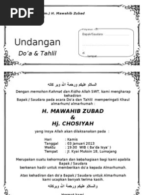 Unduh sebagai doc, pdf, txt atau baca online dari scribd. Contoh surat undangan peresmian masjid. Buku yasin dan tahlil pdf download jenis huruf tulisan pendidikan buku. Untuk mendownload file diatas telah kami sediakan linknya dibawah ini untuk mengunduhnya undangan tahlil doc, undangan tahlil word edit, undangan tahlil pdf, contoh undangan tahlilan 7 hari meninggal word, undangan tahlil 1000 hari, download undangan tahlil 1 lembar isi 2 doc, bingkai undangan tahlil, download undangan 7 hari meninggal doc, contoh undangan tahlil haul. Gambar tersebut bisa anda download langsung, caranya silahkan klik pada gambar atau klik tombol download now dibawah foto yang anda inginkan. Contoh surat undangan syukuran pernikahan microsoft word 2007, non. Tandai sebagai konten tidak pantas. download undangan tahlil siap edit cdr, download undangan tahlil word, undangan tahlil doc, download undangan tahlil siap edit doc, download undangan tahlil 1 lembar isi 2 ms word, bingkai undangan tahlil, bingkai undangan tahlil png, undangan tahlil pdf, 50+ desain undangan tahlil yang bisa di edit, yang populer! Bisa digunakan misalahnya undangan tahlil 40 hari, 100 hari atau bisa 1000 harinya. download view contoh surat undangan tahlil 40 100 1000 hari hauldoc as pdf for free. Simple and easy to … 64% (11) 64% menganggap dokumen ini bermanfaat (11 suara) 48k tayangan 1 halaman.